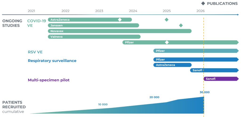 Patient recruitment started in September 2021 for the COVID-19 CVE study. The common data collection was launched on 26 July 2024 by including the surveillance study data, followed by RSV VE data collection in fall 2024. As of 31st December 2025, a total of 30,470 patients have been recruited across 39 hospitals from 21 Study Contributors in 7 European countries.